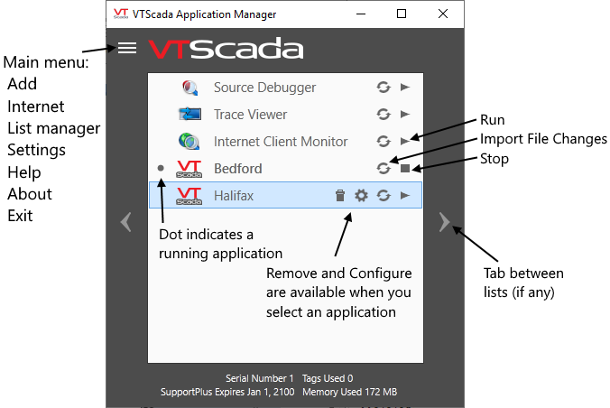 Use the VTScada Application Manager (VAM) to create and manage applications. It will open whenever you start VTScada and also at the end of the installation process. As a security precaution, applications should be configured to hide the VAM from all but authorized users while the application runs.