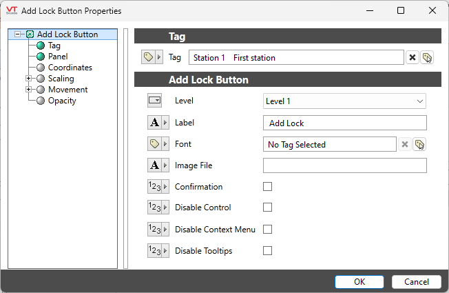 The Add Lock Button widget allows authorized operators to add a Control Lock to the linked tag. If the linked tag is a parent of other tags, then all output tags below that parent will be locked.
