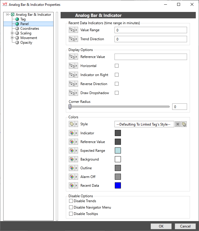 All properties other than the corner radius and the disable options may be configured using numeric values, selected tags, parameters or expressions.