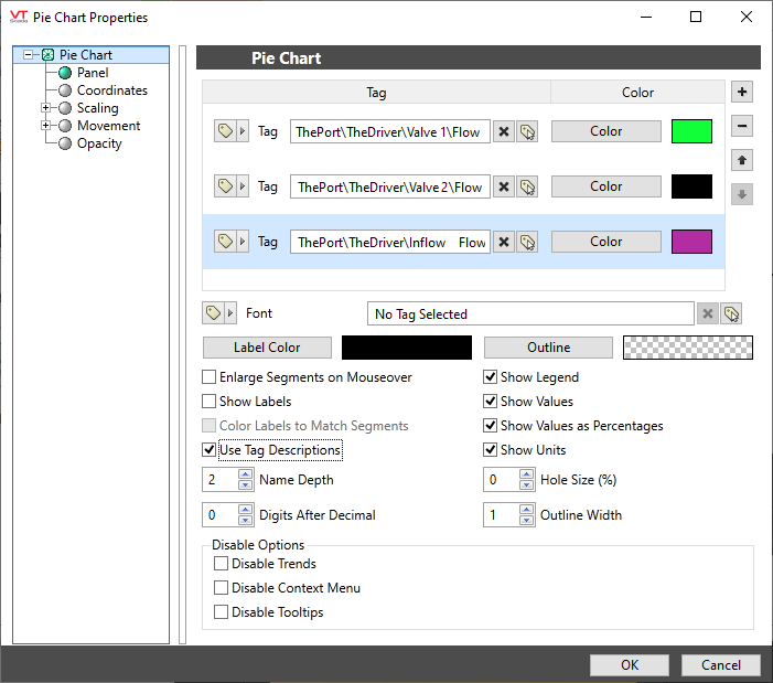 The chart updates continuously with changing values. The current sum of the included tags is taken as 100% and each slice of the pie represents the matching tag's contribution to that total.