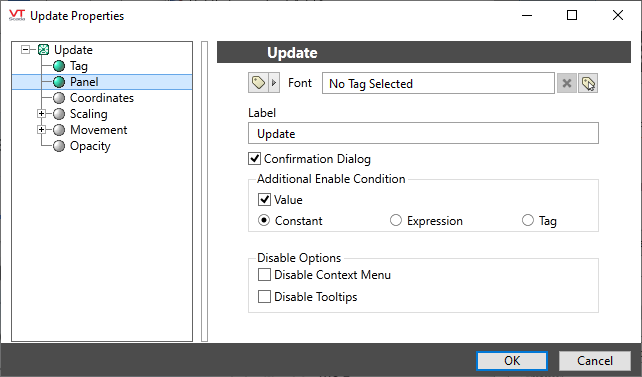 The properties dialog for the Update widget.