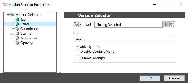 The properties dialog for the Version Selector widget. There are few user-configurable options beyond the standard operator-interface controls. Version numbers can be created while saving a recipe, assuming that this feature is enabled in the linked Recipe Book tag.