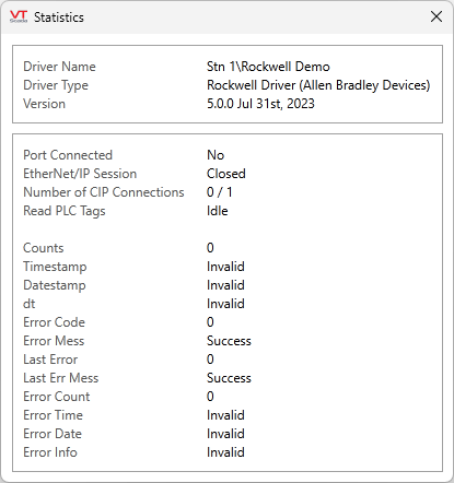The Show Stats button will display the following information about the status of a Rockwell driver instance. This information is only available on the I/O server for the driver.