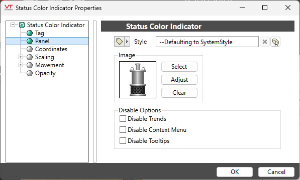 Status color indicators can be found in the folders Equipment, Indicators >> Basic, and High Performance. These are images of equipment or ISA symbols that take their color from a Style Settings tag. You can choose whether the indicator should use the style for Digitals, High Performance, or an Equipment type.