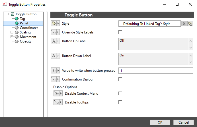 The Toggle Button widget is used to display an up / down toggle button, providing digital control and feedback.
