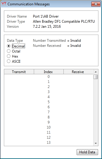 If you have the protocol information for the Allen-Bradley device, you can interpret each of the transmitted and received bytes to determine their meaning. The basic information that can be obtained from the Communication Messages window is that communications are proceeding as normal as long as bytes appear in both the Transmit and Receive columns.