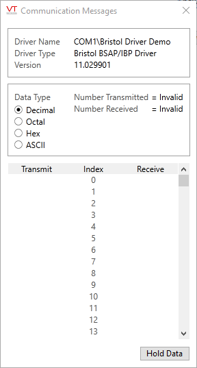The Hold Data button will freeze the display. Otherwise the dialog updates continuously as messages are transmitted.