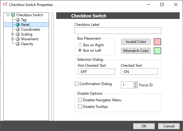 The Checkbox Switch widget is used to create an On/Off control for a two-position SelectorSwitch tag. Each time an operator clicks on the box or attached label, the switch will toggle between positions and a check mark will be displayed for position 1.