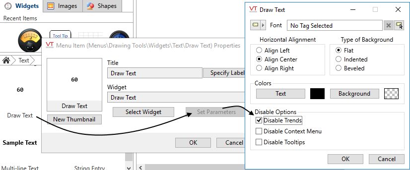 These options are stored as parameters to the widget. This means that you can right-click to edit the widget's Menu Item tag in the Widgets palette to set defaults for these parameters. Note that any given widget may have more than one entry in the palette. A change to one Menu Item will not affect any other.