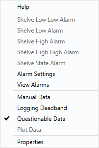 In all cases, a right-click on the widget will cause a context menu to open. The contents of this menu will vary by tag type - the image shown here is a sample. The attached tag in this case is an I/O & Calculations Tag.