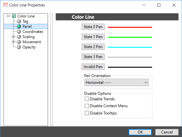 The Color Line tag widget is used to draw a line that changes any combination of color, width and style to indicate the state of the associated tag. Can be linked to most numerics, but meant primarily for digitals.