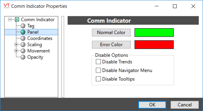 The Comm Indicator tag widget is used to draw an indicator square, the color of which indicates the current status of the associated I/O device.