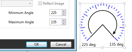 If the radial scale option is selected, set the minimum and maximum values for the scale to fill. Values are measured clockwise from vertical, and the scale will fill from the angle specified as minimum, clockwise to the angle specified as maximum. By way of illustration, note the scale resulting from the default angles, where the minimum (start of the scale) is a larger value than the maximum (end of the scale).