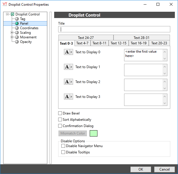 The properties dialog for the control will appear similar to the following. Note that the control will always output values up to the largest text value configured. Should you skip one of the Text To Display boxes, that value will still be included in the drop list, but will display nothing to tell operators what it is.