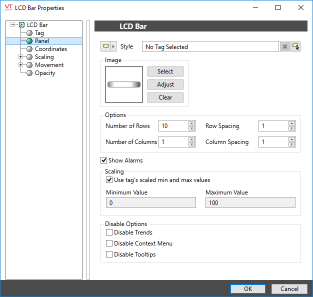 The LCD Bar widget represents the associated tag's value as an dot matrix (LED) display. If configured, an active alarm will cause the dots above the alarm set point to use the alarm color. Two versions are included in the palette: one with a single column of wide images and one with an array of small images.