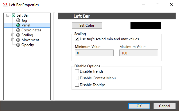 The Left Bar widget is used to display a tag's value as a horizontal bar, the length of which increases from the right towards the left as the tag’s value increases. When the tag’s value is at a minimum, the bar will be shown as a thin line at the right edge of its range. When the tag’s value reaches its maximum, the widget will be displayed as a rectangle, filling the range.