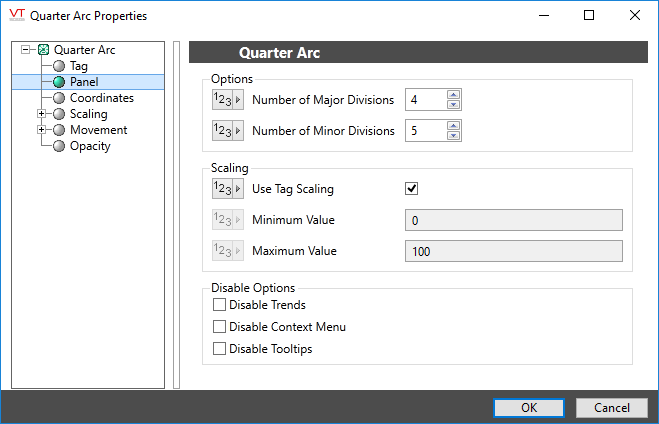 You can override those values to set your own scale range. For example, assume that you have a tag for which the minimum and maximum scaled process values are 20 and 80 respectively. Drawing this tag with a minimum value of 0 and a maximum value of 100 will result in a meter that shows a full range of numbers from 0 to 100, but whose needle will move only between 20 and 80.