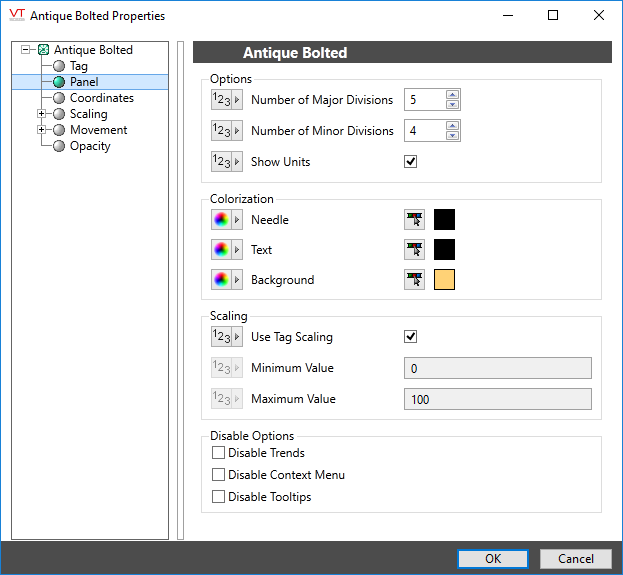 If Use Tag Scaling is selected, the minimum and maximum range of the meter will be controlled by the tag's scaled minimum and maximum values.