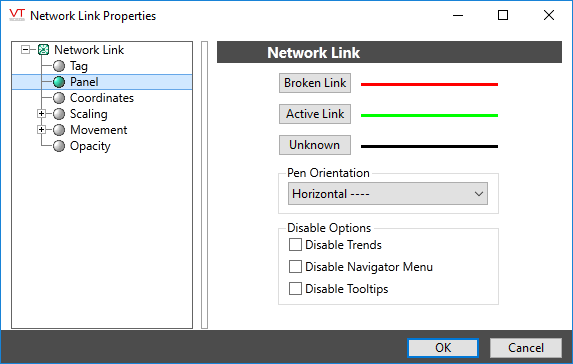 The Network Link tag widget is used to draw a line indicating the value of the associated Network Status tag. It can tell an operator whether the network link is active, broken or if its current status is unknown.
