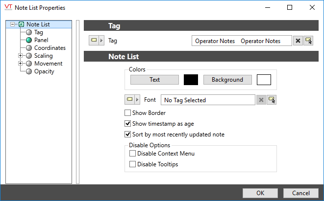 The display can be configured for color (text and background), font, etc. The properties dialog for the Note List widget: