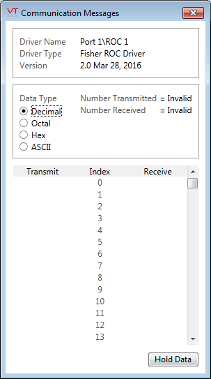 The Hold Data button will freeze the display. Otherwise the dialog updates continuously as messages are transmitted.