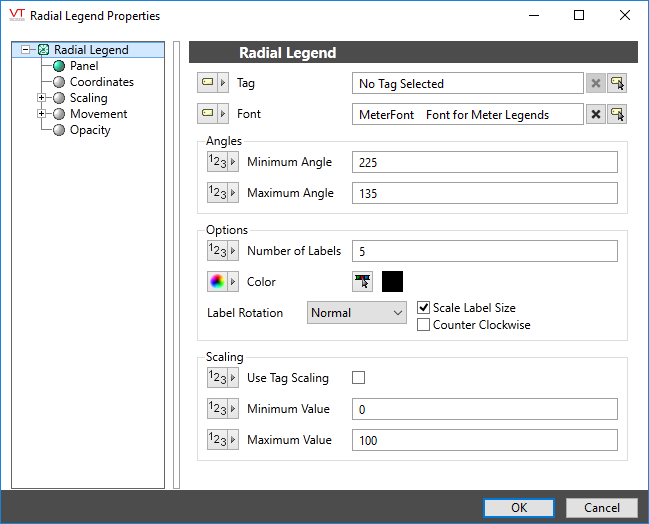 The legend must be linked to a tag before it can be grouped into a new meter as part of a tag widget. Also, a tag must be selected before the "Use tag's scaled min and max values" option can be chosen in the Scaling part of this dialog.