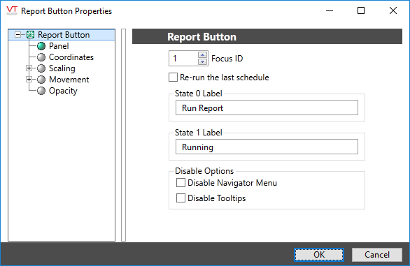 The State 0 label should contain just enough text to allow the operator to know which report will run when the button is clicked and the time frame that will be included in the report (especially if the Re-run last schedule option is selected). The State 1 label should provide confirmation that the button has indeed been clicked upon.