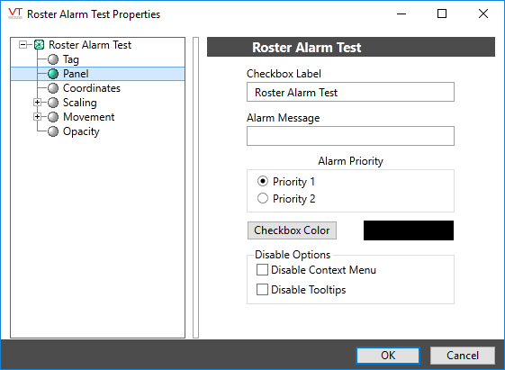 The Roster Alarm Test widget is used to create a check box that operators can click to generate an alarm that will test the roster configured for the Alarm Notification System.