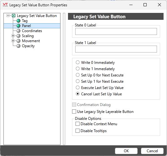 The Legacy Set Value Button tag widget is similar to the Push Button widget, but with a plain appearance and more options. It is used to create a button that operators can use to write any given value to an RTU or PLC.