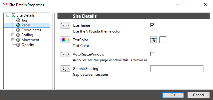 Must be numeric, corresponding to any of the colors in the VTScada palette. Used for text within the Site Details page, including labels of I/O tags. Defaults to 15, which is white.