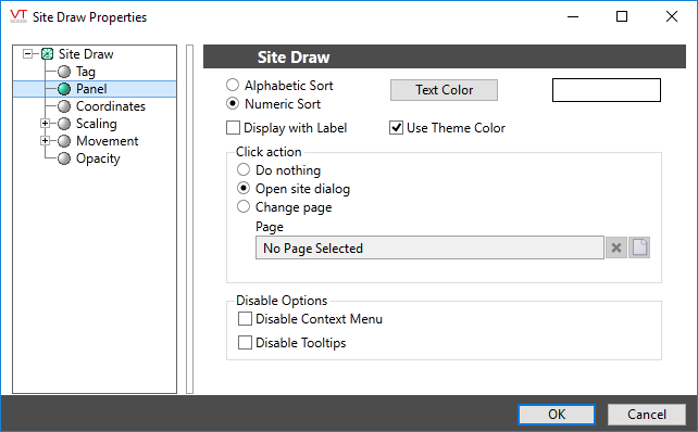The usual action upon clicking a Site Draw dot is for the site dialog to open. This dialog-type page is automatically drawn by VTScada. As an alternative, you may choose to have no action occur, or you may select any page that you have created for the site. If using your own page instead of the site dialog, you should consider parameterizing that page so that it may display the tags relevant to the given server. See: Page Properties Parameters Tab.
