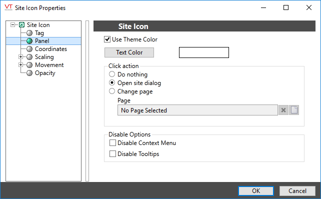The usual action upon clicking a Site Icon dot is for the site dialog to open. This dialog-type page is built into your application. As an alternative, you may choose to have no action occur, or you may select any page that you have created for the site. If using your own page instead of the site dialog, you should consider parameterizing that page so that it may display the tags relevant to the given server. See: Page Properties Parameters Tab.