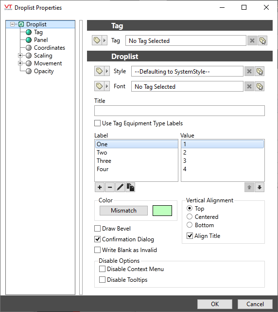 The Droplist widget can write an operator-selected value from a defined list to an output device. The write occurs when a value is selected in the list. Use of the confirmation dialog is suggested.