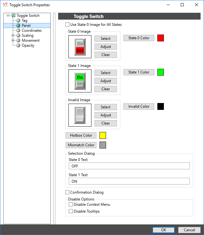 If the selector switch starts from an invalid or unknown position, it must determine which state the operator intends, the first time that it is clicked. The Selection Dialog will be displayed with the text you enter for State 0 and State 1 to prompt the operator upon first click.