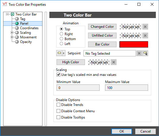 Choosing not to use the tag’s scaled min and max values enables the Minimum Value and Maximum Value controls which you can use to scale the bar length relative to the tag’s output scaled values. The scaling you set will apply only to this one instance of the tag widget. This option is normally used when the object represents tags such as Calculation and Function that do not have their own scaled values.
