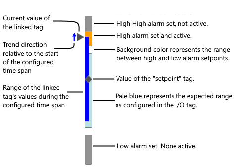The Analog Bar and Indicator provides a wealth of current and historical data to the operator at a glance. You have a wide range of configuration options. Note that colors used within the bar are controlled by the attached Style Settings tag.