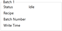 The Batch Status widget is used to display information about a recipe batch. Details include the name of the linked recipe tag, the current status, the recipe name, batch number and the last write time.