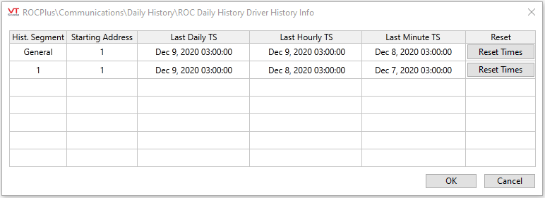 Creates a button that operators can press to reset all of the device's history addresses, resulting in a full read of the RTU on the next poll, rather than only those records that were added since the last successful poll. This will have no effect on data that has already been saved by the VTScada Historian.