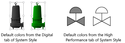 Status color indicators can be found in the folders Equipment, Indicators >> Basic, and High Performance. These are images of equipment or ISA symbols that take their color from a Style Settings tag. You can choose whether the indicator should use the style for Digitals, High Performance, or an Equipment type.
