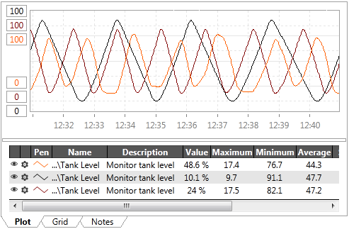 The Sparklines widget is similar to a Plot widget but allows operators to see at a glance whether the tag has values below, within, or above the expected range.
