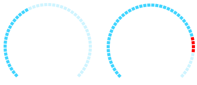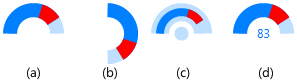 The Arc widget represents the associated tag's value as portion of an arc. The darker portion of the arc starts at the angle you specify, where vertical (North) is zero degrees. Increasing values are indicated by the darker portion sweeping in a clockwise direction. The colors are set by the LED (analog) values of a selected Style Settings tag, and values above the linked tag's alarm setpoint can be indicated.