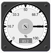 The Cockpit Gauge widget represents the associated tag's value as a photorealistic meter, displaying both labeled major divisions and unlabeled minor divisions, the dial of which fluctuates according to the tag's value.