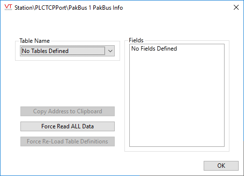 The driver needs to read in a set of Table Definitions from the logger before it can read records. This dialog shows operators what definitions have been read. Select a table from the droplist to display a list of the fields.