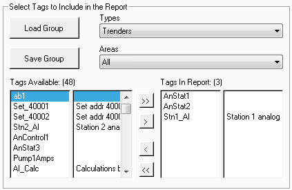 The Report Tag List tag widget is used to draw a group of tools that operators can use to select the tags to be included in a report.