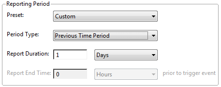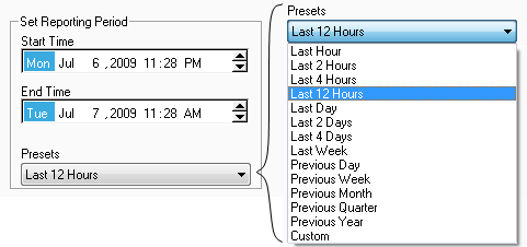 The Reporting Period widget is used to draw spin boxes and a drop-down list that operators can use to configure the time period for a report. The available presets are shown to the right of the completed widget: