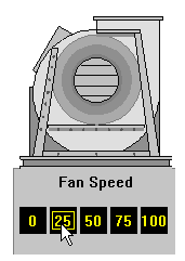 The Set Analog Value widget is used to create a button that operators may click to write a specific value to an I/O address of the associated tag. Several may be drawn to provide a range of value choices. Note that the configured value is not shown as part of the widget - if you would like it to appear (as shown in the following example) the value must be drawn on the page as text.