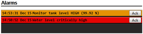 Used to draw a customizable alarm list on any application page. This is what you see in the The Alarm Page, including all tools and filters. When drawing your own list, you have control over which portions of it are shown and how they are configured. You can recreate the alarm page (all options enabled), create a minimalist alarm banner, or some variation in-between.