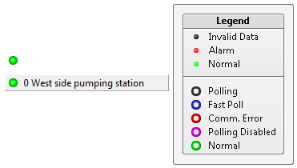 A Site Draw legend is available in the Site Tools folder of the Widgets palette. Adding this to your page will help operators interpret the meaning of the color indicators. The center dot will change color according to the status of I/O within the site - Invalid data or an alarm in any I/O tag will indicted by the dot. The outer ring indicates the status of device driver communication with the site.