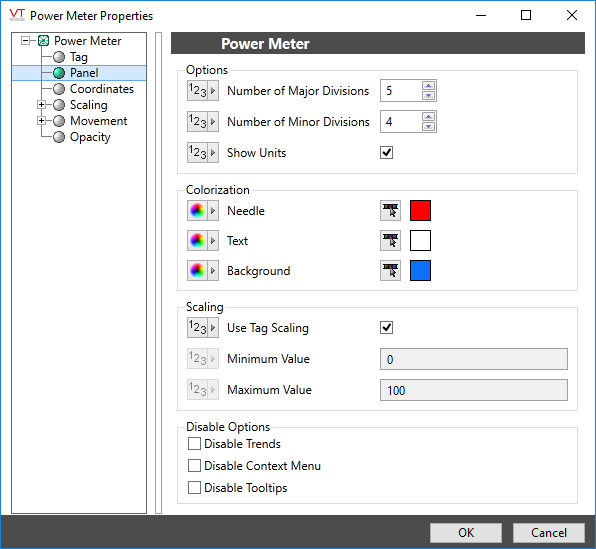 If Use Tag Scaling is selected, the minimum and maximum range of the meter will be controlled by the tag's scaled minimum and maximum values.
