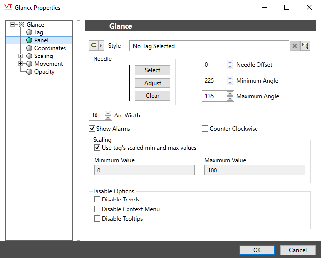 If Use Tag Scaling is selected, the minimum and maximum range of the meter will be controlled by the tag's scaled minimum and maximum values.